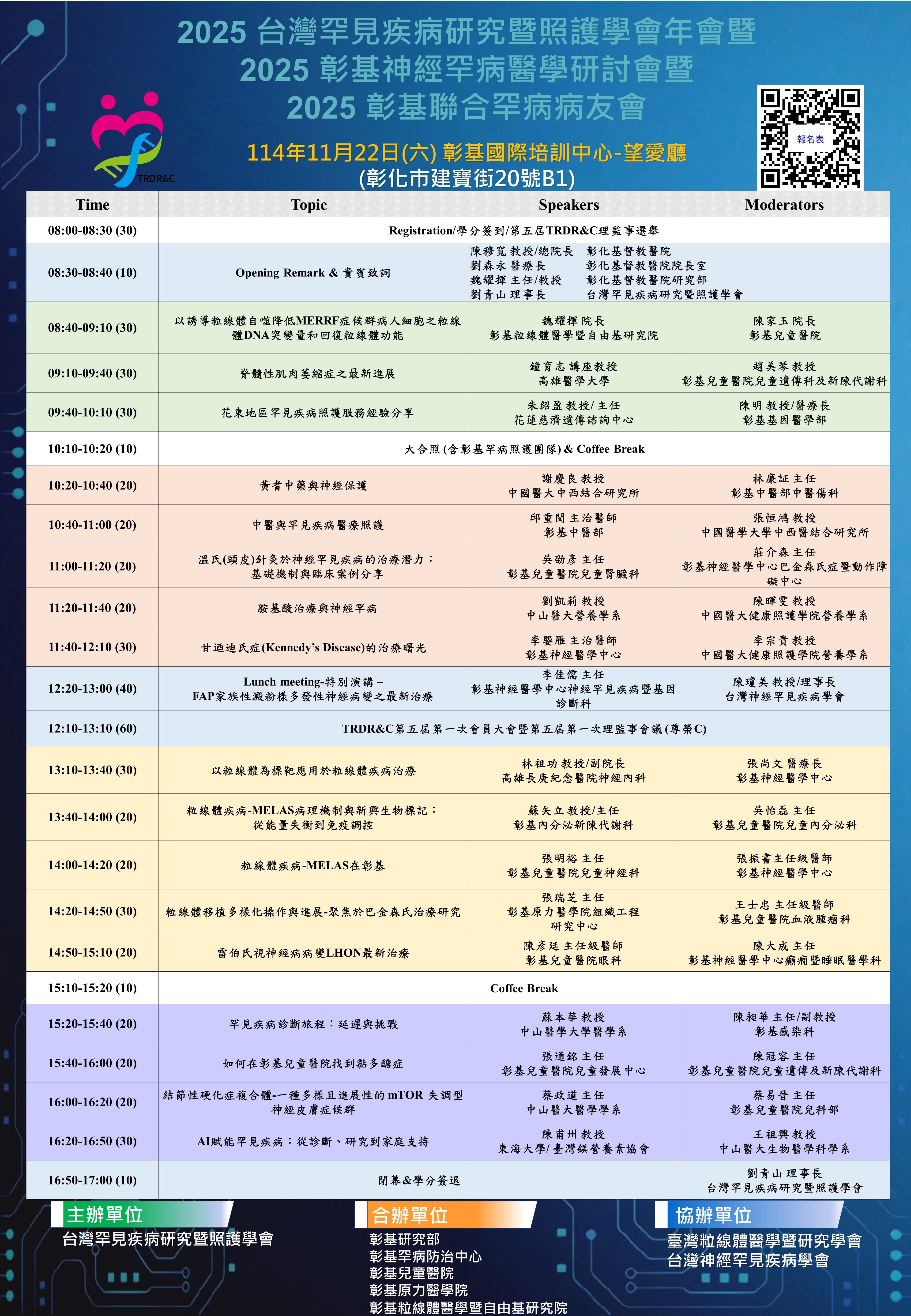 今年的主題:罕病曙光,涵蓋罕見疾病粒線體醫學、神經代謝遺傳疾病、再生醫療到中西醫整合療法的最新突破。我們特別榮幸邀請到多位來自國內各大醫學中心的重量級講者,與大家深入探討罕見疾病的臨床經驗與研究成果,治療策略與AI應用等嶄新療法的發展前景。