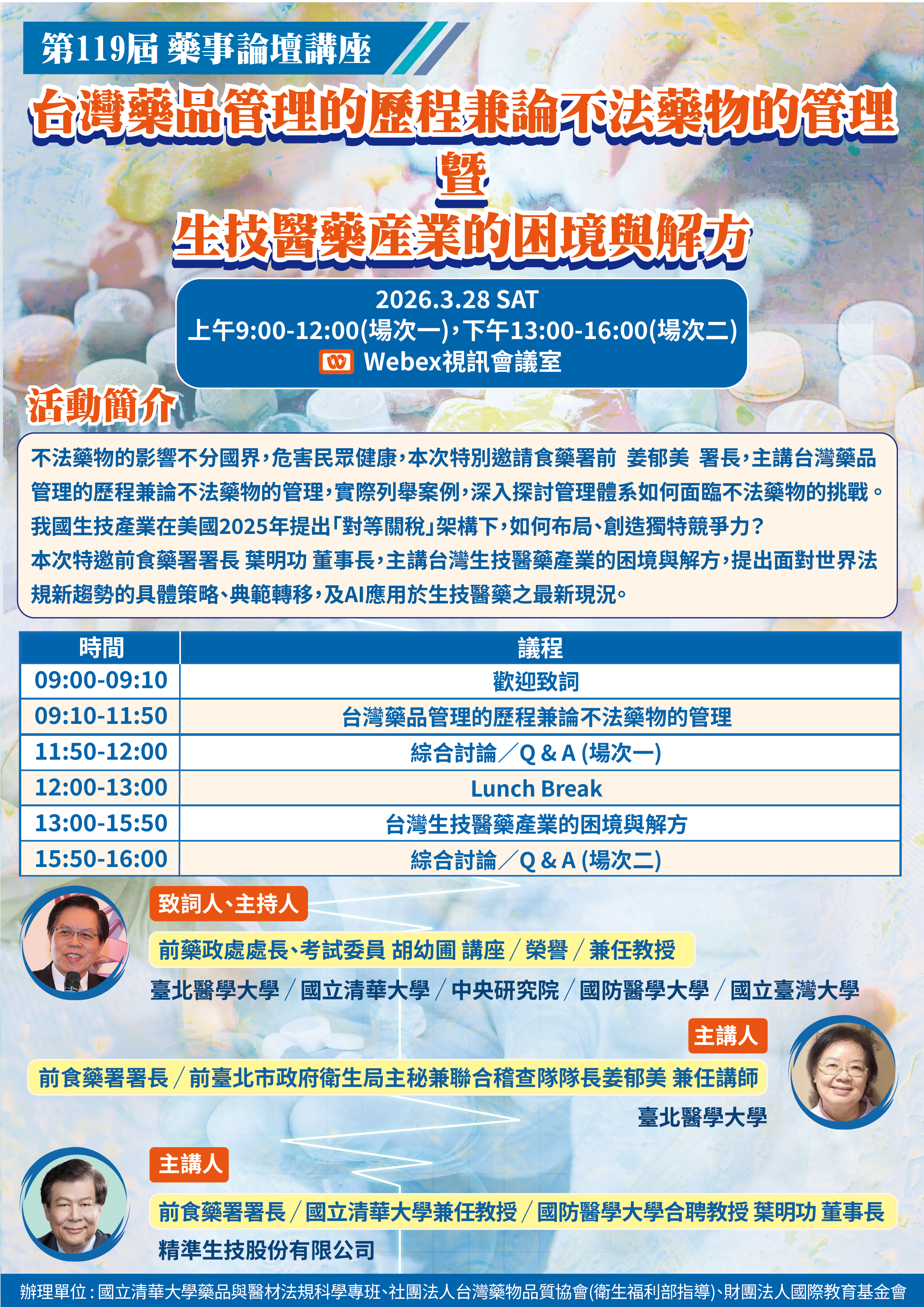 115年3月28日(六) 上午9:00-12:00(場次一),下午13:00-16:00(場次二)Webex視訊會議室